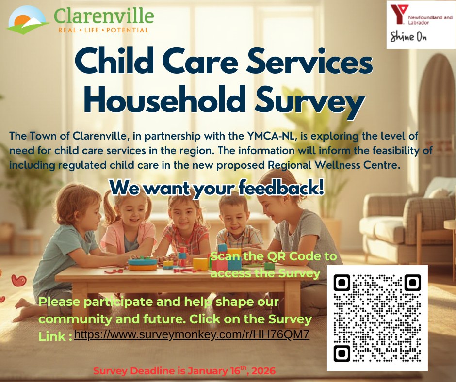 The Town of Clarenville, in partnership with the YMCA-NL, is exploring the level of need for child care services in the region. The information will inform the feasibility of including regulated child care in the new proposed Regional Wellness Centre. Here is the Survey link: https://www.surveymonkey.com/r/HH76QM7