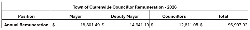 “Town of Clarenville Council members receive remuneration for their service as set by the Town’s Municipal Budget that is adopted each year.